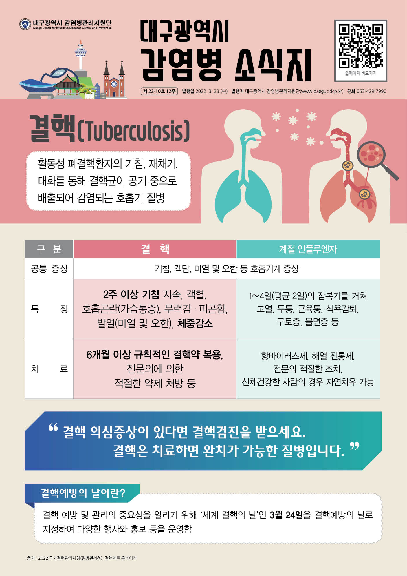 결핵 예방 및 관리의 중요성을 알리기 위해 '세계 결핵의 날'인 3월 24일을 결핵예방의 날로 지정하여 다양한 행사와 홍보 등을 운영합니다.
