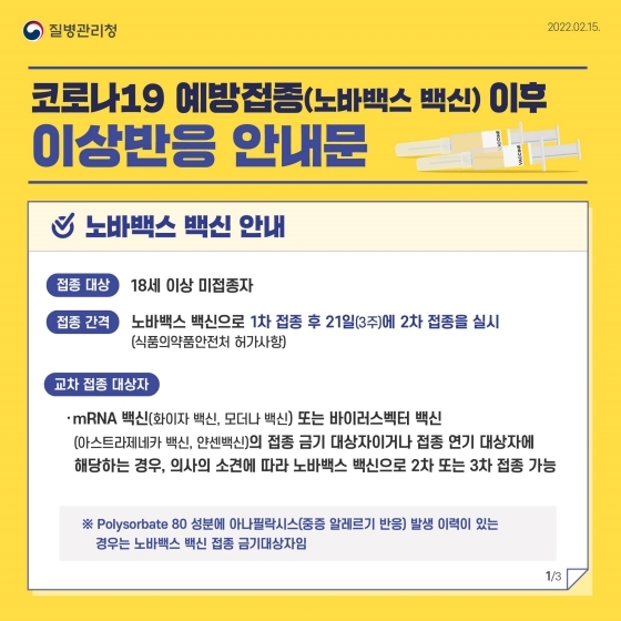 ※ Polysorbate 80 성분에 아나필락시스(중증 알레르기 반응) 발생 이력이 있는 경우는 노바백스 백신 접종 금기대상자임