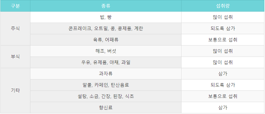 | 구분 | 종류 | 섭취량 |