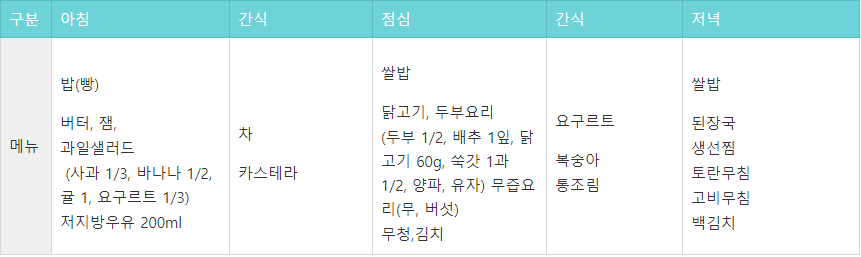 | 구분 | 아침 | 간식 | 점심 | 간식 | 저녁 |