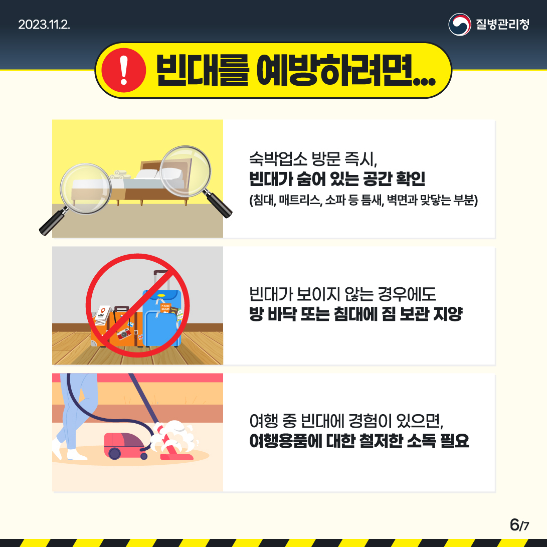 1. 숙박업소 방문 즉시, 빈대가 숨어 있는 공간 확인(침대, 매트리스, 소파 등 틈새, 벽면과 맞닿는 부분)