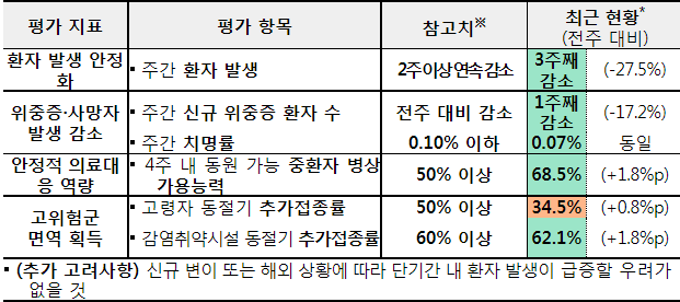 - ①환자 발생 안정화, ②위중증·사망자 발생 감소, ③안정적 의료대응 역량 3가지 지표가 참고치를 달성하였고, ④고위험군 면역 획득 지표 항목 중 감염취약시설 동절기 추가접종률 또한 1.13.을 기점으로 참고치 달성