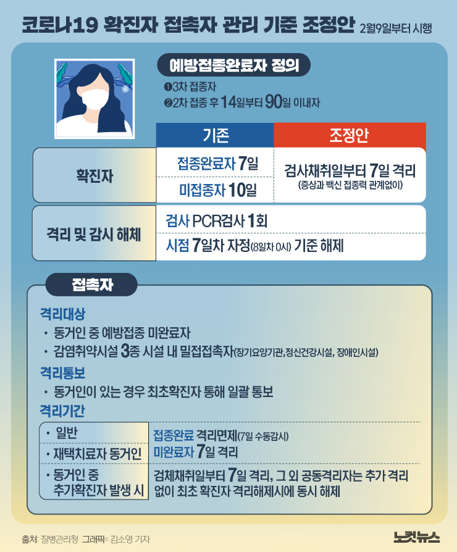 기존 : 접종완료자 7일, 미접종자 10일 -> 조정안 : 검사채취일부터 7일 격리(증상과 백신 접종력 관계없음)
