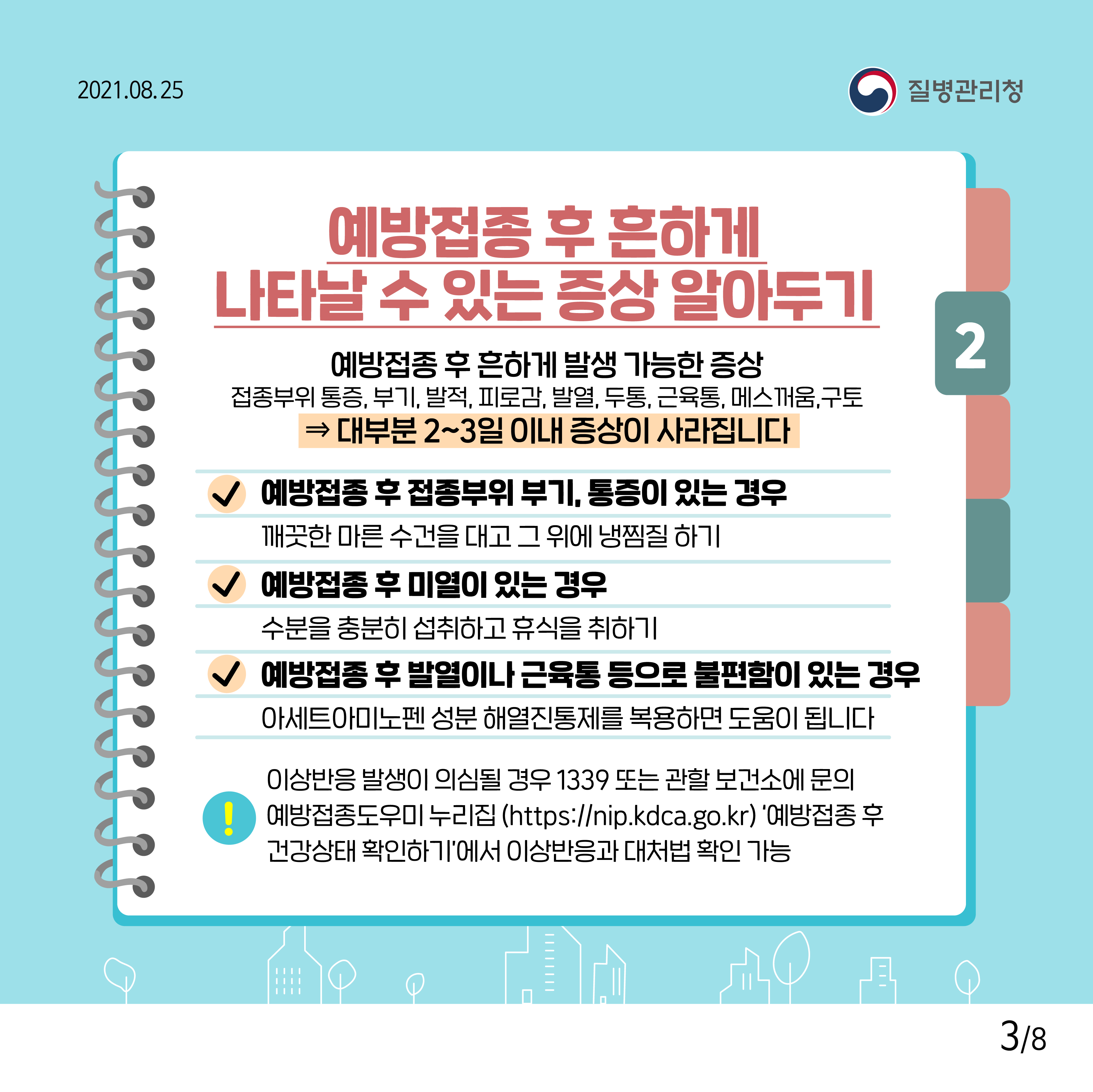 - 예방접종 후 최소 3일 정도는 특별한 관심을 가지고 관찰
