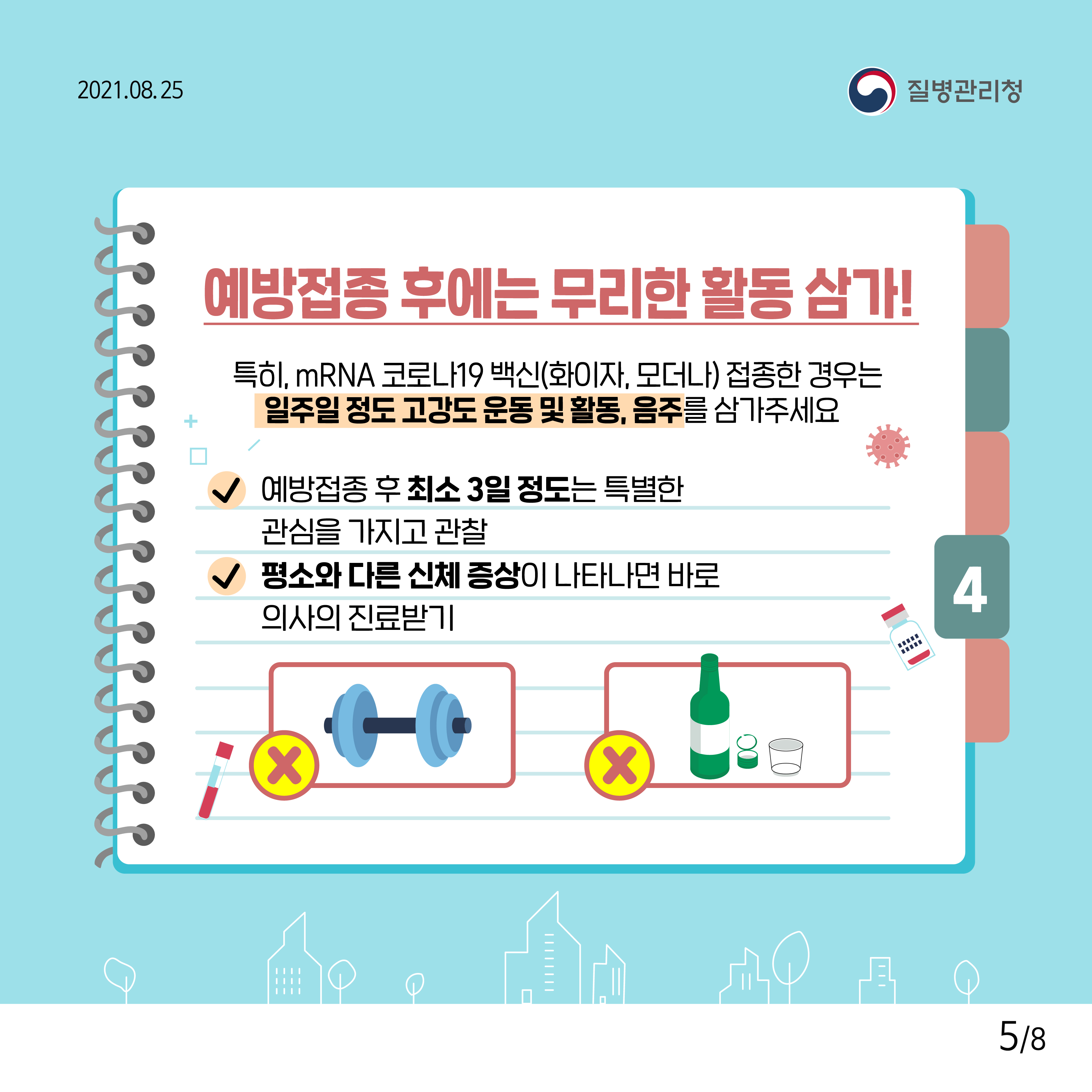특히, mRNA 코로나19 백신(화이자, 모더나) 접종한 경우는 일주일 정도 고강도 운동 및 활동, 음주를 삼가주세요.