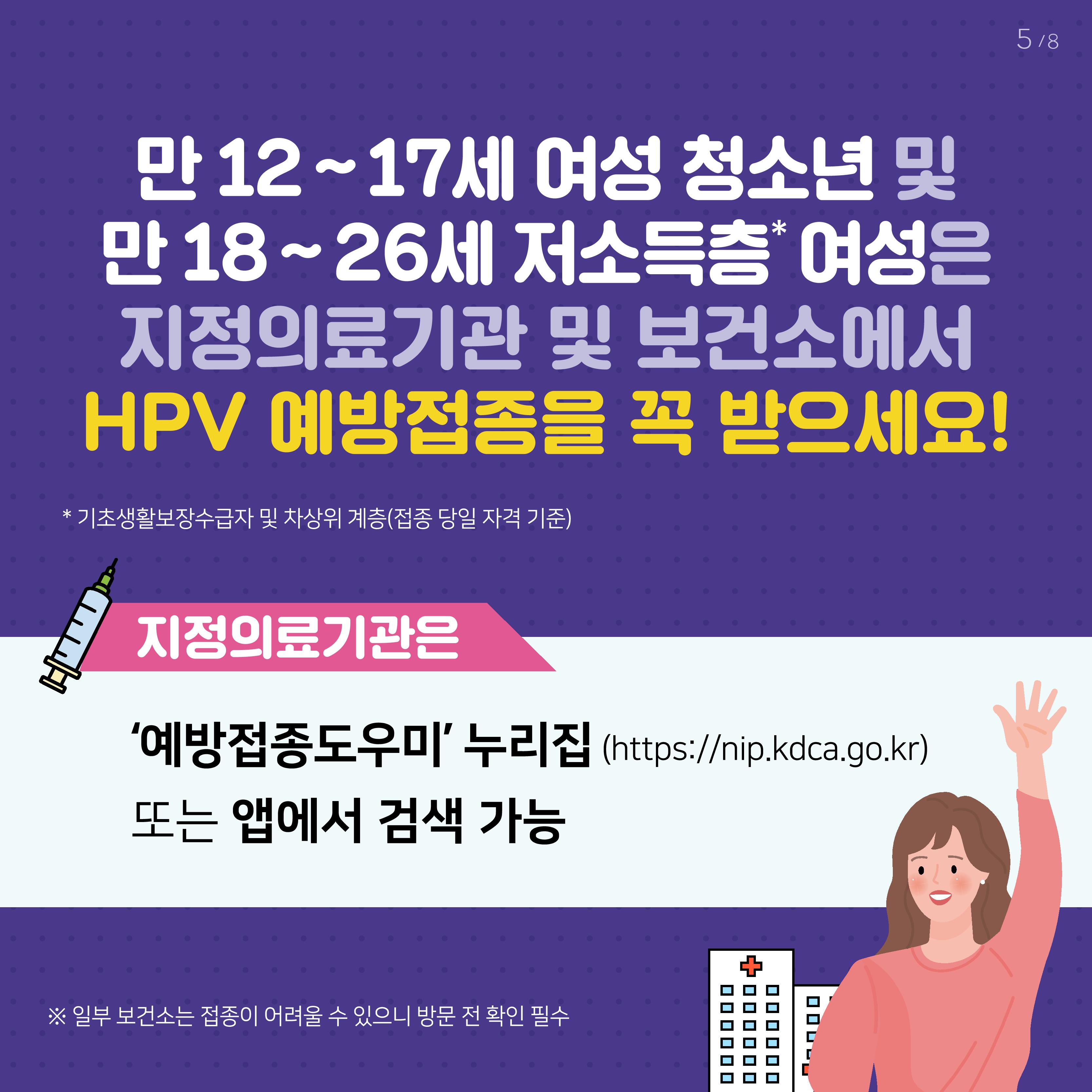 만 12~17세 여성 청소년 및 만18~26세 저소득층* 여성은 지정의료기관 및 보건소에서 HPV 예방접종을 꼭 받으세요!