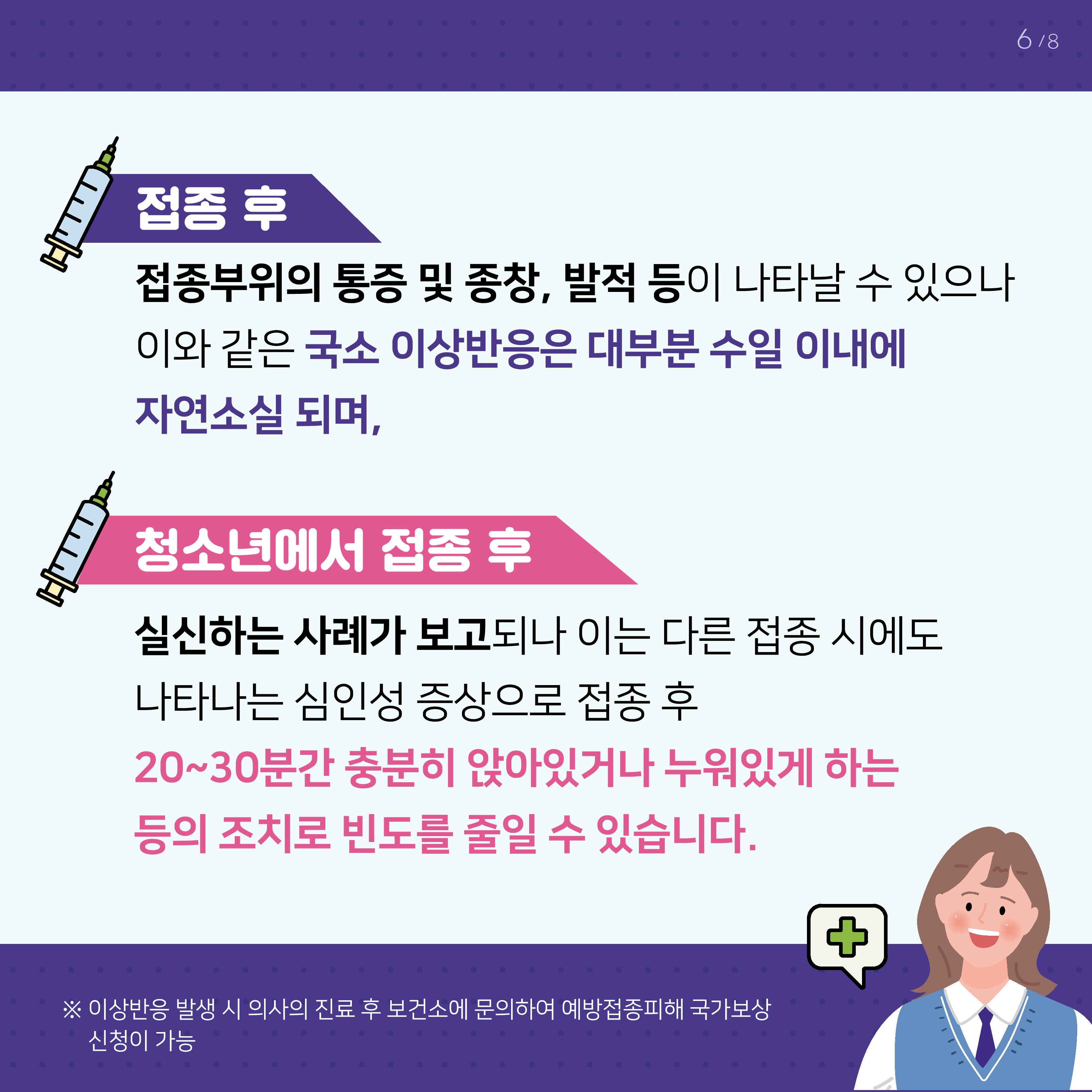 ※이상반응 발생 시 의사의 진료 후 보건소에 문의하여 예방접종피해 국가보상 신청 가능