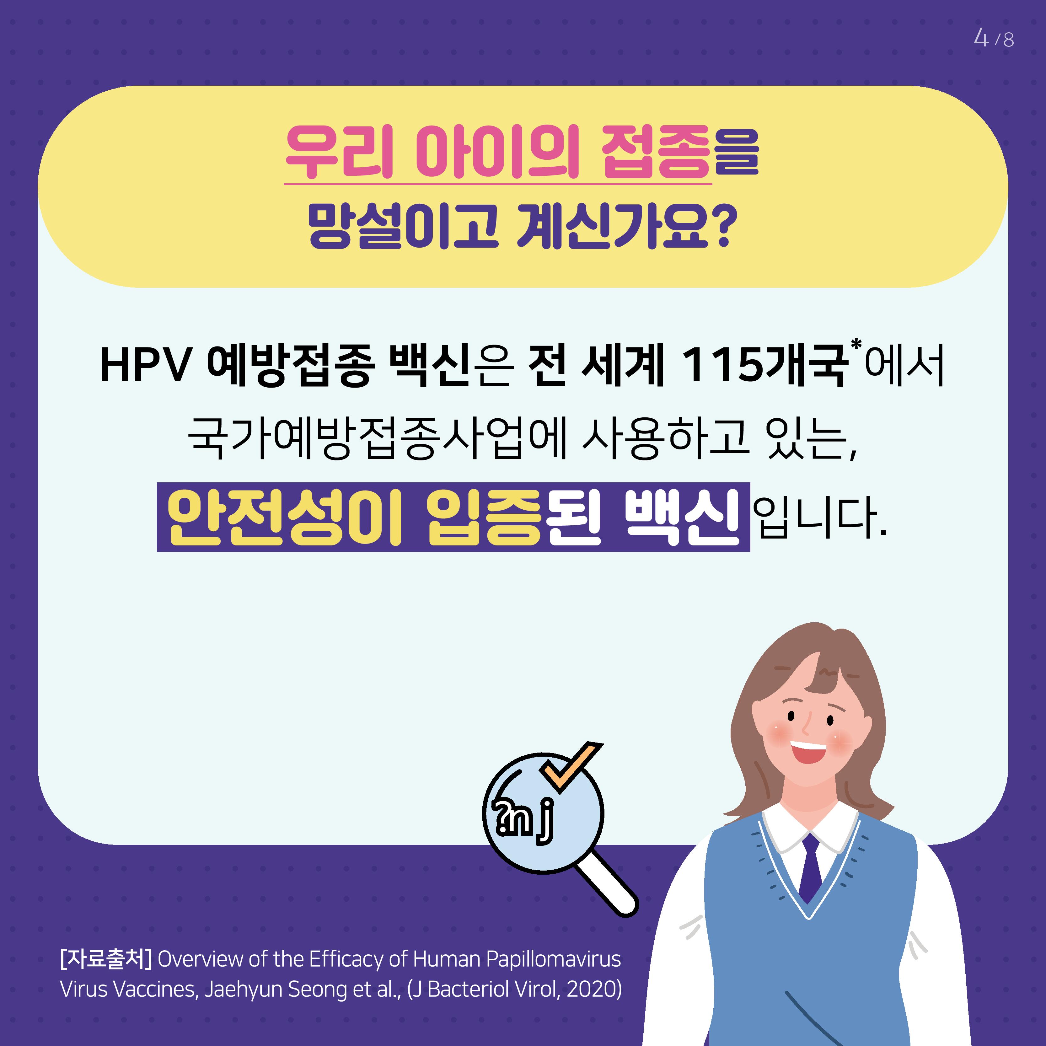 HPV 예방접종 백신은 전세계 115개국*에서 국가예방접종사업에 사용하고 있는, 안전성이 입증된 백신입니다.