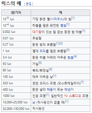 1룩스(lux) 조도(illuminance) 루멘/m^2 : 1루멘의 불빛이 1미터 떨어진 1제곱미터의 면에 골고루 비춰지는 빛의 양으로. 초 하나 정도를 밝기를 떠올리면 된다. 400룩스는 맑은 날의 해돋이 또는 해넘이 빛 정도라고 할 수 있다.